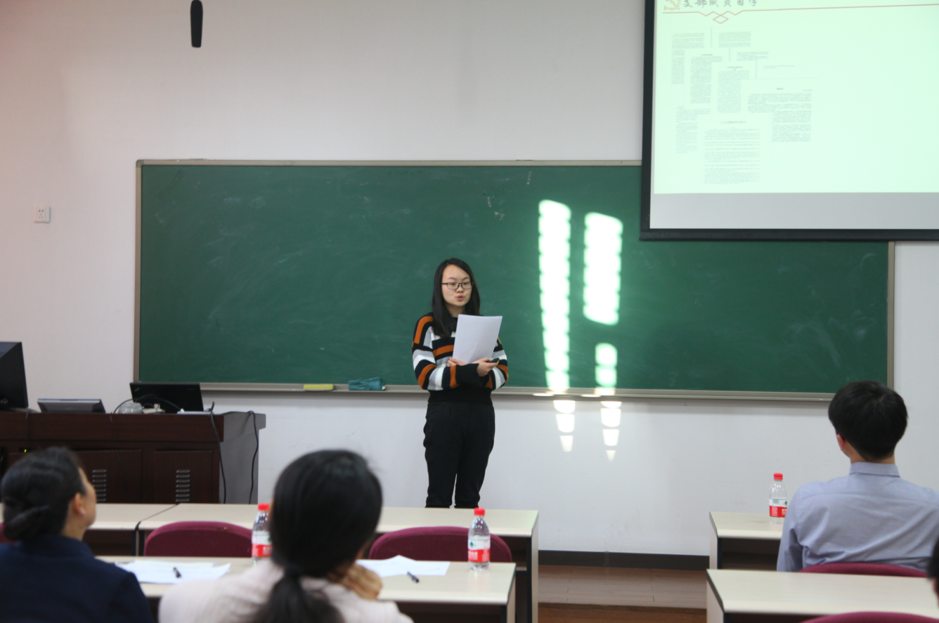 张琼洁代表2017级硕士生党支部汇报了他们的学习成果。她以分享支部成员学习心得体会的形式,介绍了支部成员的学习情况。在专题解读部分,该党支部以“青年”、“初心”和“锤炼”三个关键词为主题,阐释了青年人的使命和责任。