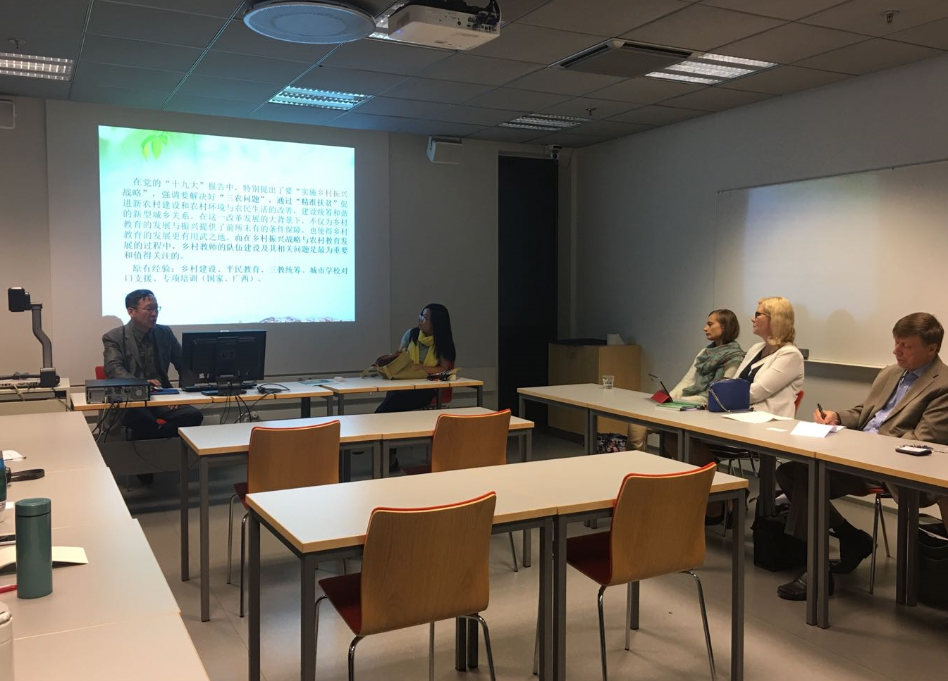 8月22日上午,代表团与芬兰赫尔辛基大学yl6809永利以“中芬教育质量研究”为主题进行了研讨交流。公司代表申素平教授、程方平教授、曹淑江教授、付尧讲师分别就中国教育法律研究现状、中国乡村教师发展现状、中央和地方政府的教育职能、中国城镇间义务教育人员性投入的差异进行了主题分享。