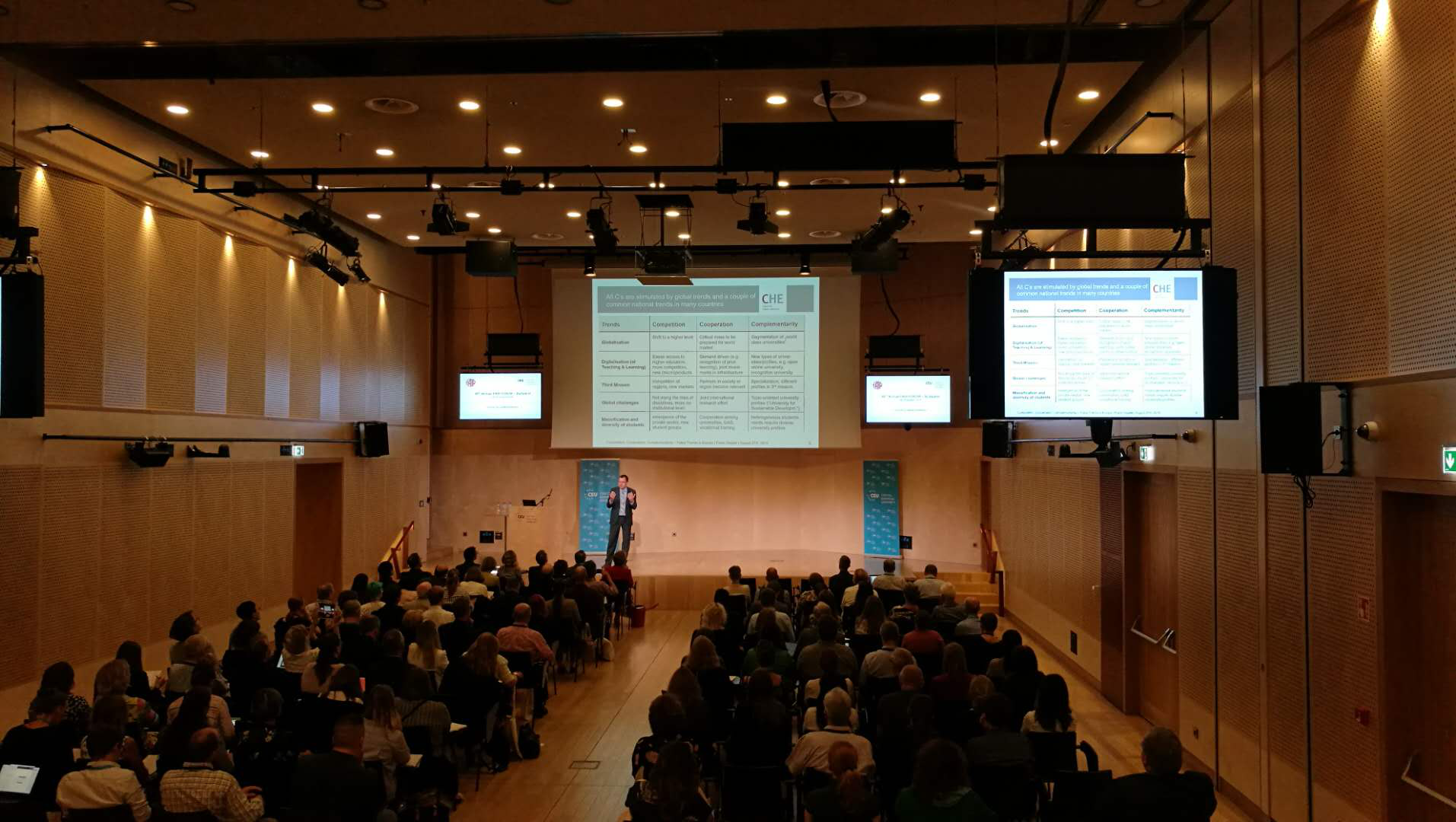 本届大会的主题是高等教育中的竞争、合作与互补(Competition, Collaboration & Complementarity in Higher Education),开幕主题报告由欧洲高等教育研究中心的Frank Ziegele主任介绍了在3C(Competition, Collaboration & Complementarity)框架下如何利用不同政策工具,诸如财政资金、目标协议和战略规划等对高等教育发挥重要作用。报告还试图识别和评估这种框架对系统和机构层面的影响,以及欧洲高等教育未来的发展趋势。