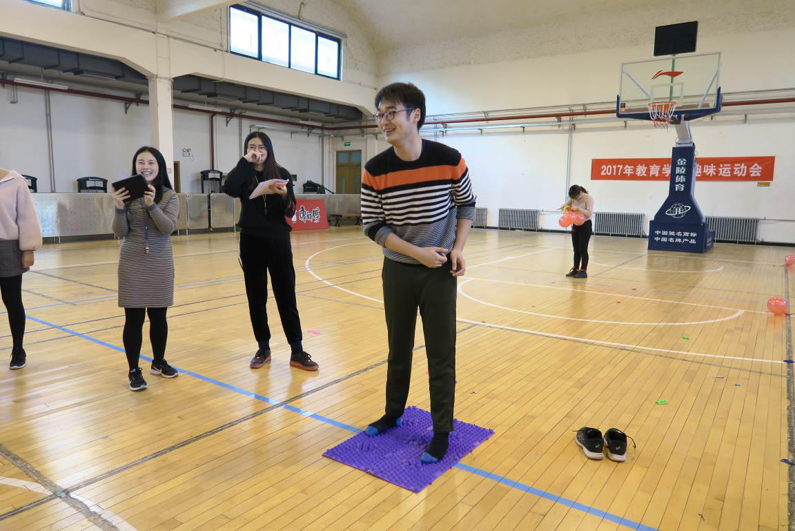 第一个项目是“气球大战”。每组队伍成员在双脚上绑上气球,然后两两队伍相互踩气球。五颜六色的气球,随着同学们的脚步舞动。红的、蓝的、黄的、绿的气球,不断被踩爆,发出“啪啪”的声响。此轮比赛过后,“红领巾”队和“梦之蓝”队领先一步。大家的运动劲头也被充分调动起来,之前略显紧张的同学也渐入佳境,积极投入到活动中,现场气氛浓烈。