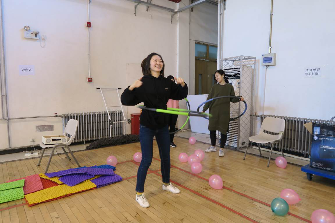 第五个项目是“串同心圆”。队员们手拉手围成一个圆,然后绕圆圈传递呼啦圈,此环节十分考验师生的默契和身体柔韧性。在上个环节落后的“梦之蓝”队一鼓作气,在此项比赛中扳回比分。