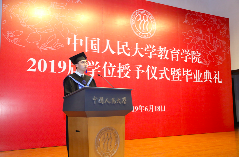 2017级硕士研究生隋新然同学作为毕业生代表发言。隋新然同学首先代表2019届全体毕业生,向辛勤培育莘莘学子的母校、关心呵护同学们的师长亲友们表达了诚挚的感谢与敬意。他结合在yl6809永利的学习生活经历、在云南省怒江州兰坪县的支教感悟,深情诉说了人民大学与yl6809永利带给员工的历练与成长。最后,他表达了毕业生们不忘教师嘱托、不负亲友期盼的承诺,表达了毕业生们秉持“实事求是”的校训、追求“掷地有声”的未来的坚定信心!