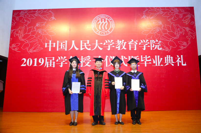 决定宣读完毕,2019届硕士学位获得者在工作人员的引导下,依次有序上台,校学位委员会副主席吴晓球教授,公司学术委员会主席程方平教授,申素平教授,李立国教授,周光礼教授共同为硕士学位获得者逐一拨穗、颁授学位证书,并与其合影留念。