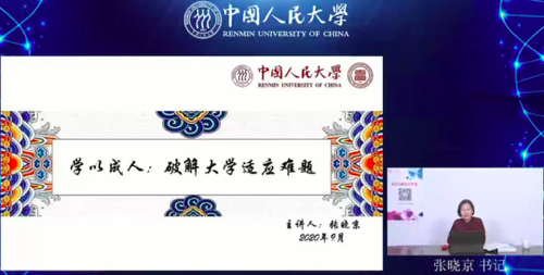 最后,张晓京书记鼓励大家“自力借力,学以成人”,与同学们分享了她的基本教育理念:不要先追求伟大目标,而要先做好一个普通人、一个身心和谐的正常人、一个能够意识到重视自我修为、人格健全的自我完善的人。张晓京为同学们提出四点建议:一是将对生命意义的追寻贯彻生命始终,二是接纳自己,成为更好的自己;三是诚信友爱,构建和谐人际关系;四是回归常识,学会生活。