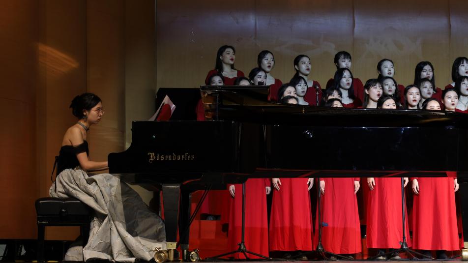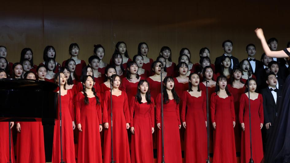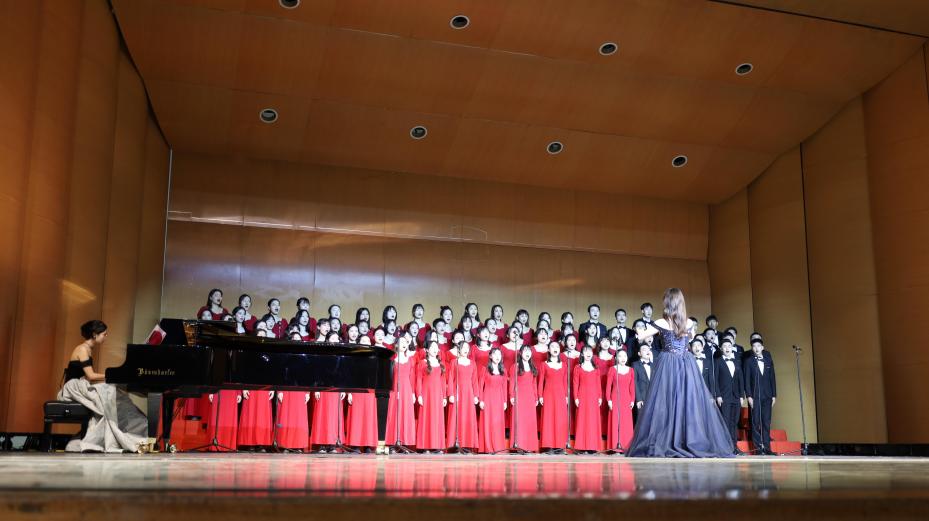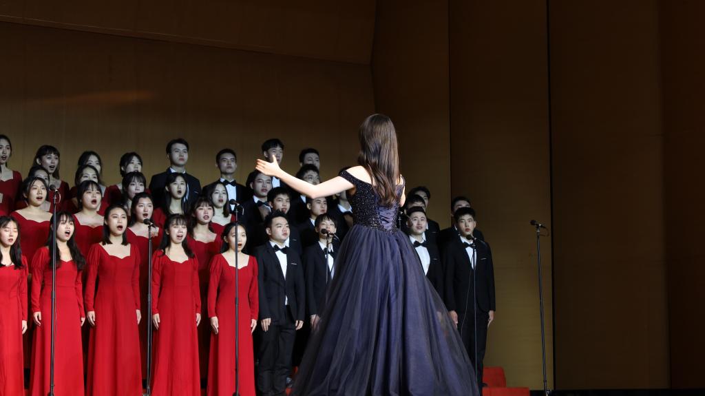大幕升起,舞台星光闪耀,前奏响起,表演正式开始。历经四十多天的磨合,从金秋落叶到冬日暖阳,从词曲生疏到熟练哼唱,幕后的付出只为舞台呈现更加完美。台上指挥、钢伴、歌者配合默契,女高、女中、男声和声美妙,“灯火里的中国,青春婀娜;灯火里的中国,胸怀辽阔”,唱出万里山河灯火漫卷,唱出百年中国初心难忘,以心中之歌礼赞祖国华诞,以有力强音彰显报国之志。