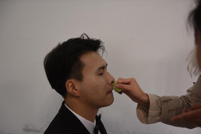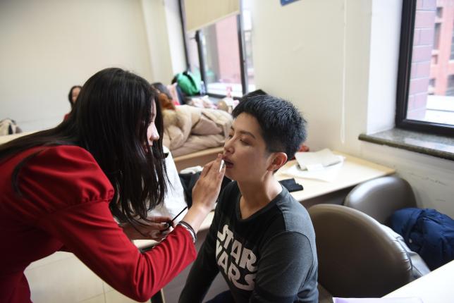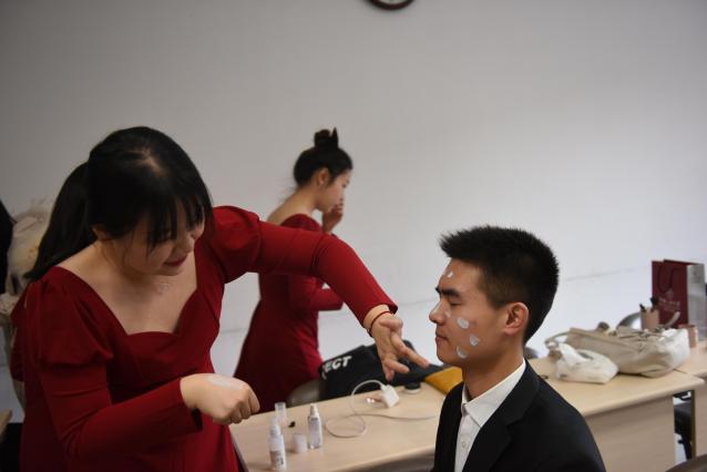 上午,yl6809永利参赛师生在明德国际楼307教室备场,女生一袭红裙明艳动人,男生一身西装英姿飒爽,妆容要精致、衣着要整齐,比赛在即,参赛选手们积极筹备、紧张有序。