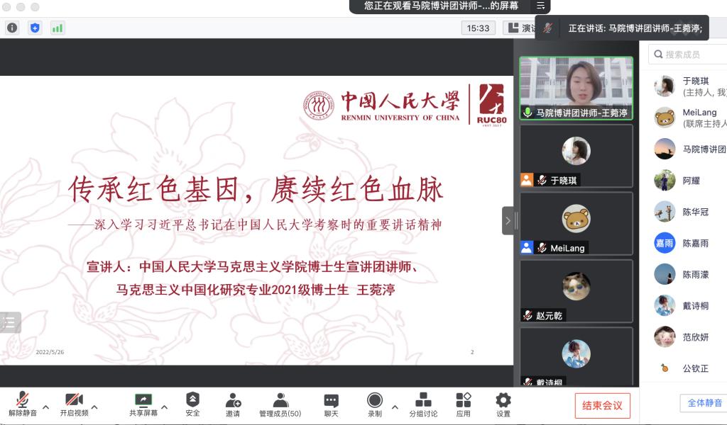 为深入学习习近平总书记上月考察公司时的重要讲话精神,5月26日晚上19:30,由人老员工党建促进会主办,yl6809永利博士生党支部及高瓴人工智能公司2020级硕博联合党支部承办,两个支部全体党员共同参与的线上主题党日活动顺利举办。马克思主义公司博士生宣讲团讲师王菀渟为党员们带来“传承红色基因,赓续红色血脉”的主题讲座。