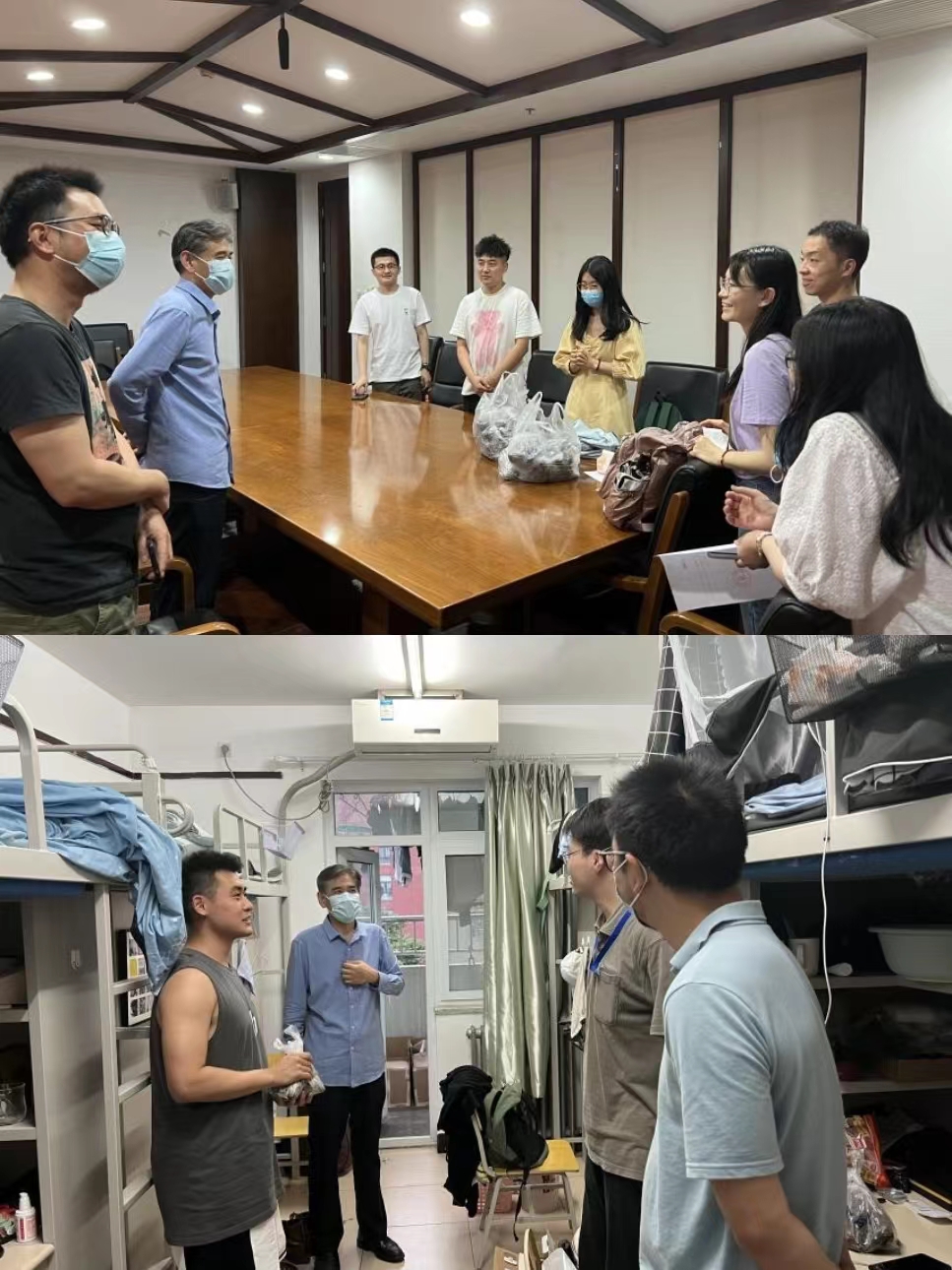 刘复兴、崔盛走访了男生宿舍,和同学们展开深入交流,了解同学们在校期间遇到的问题、目前的学业进展、未来就业规划等,并鼓励同学们在校合理安排时间、做好完备规划、不断充实自我,用饱满向上的状态迎接疫情带来的多方面挑战。老师们为同学发放粽子,送上端午节的祝福。