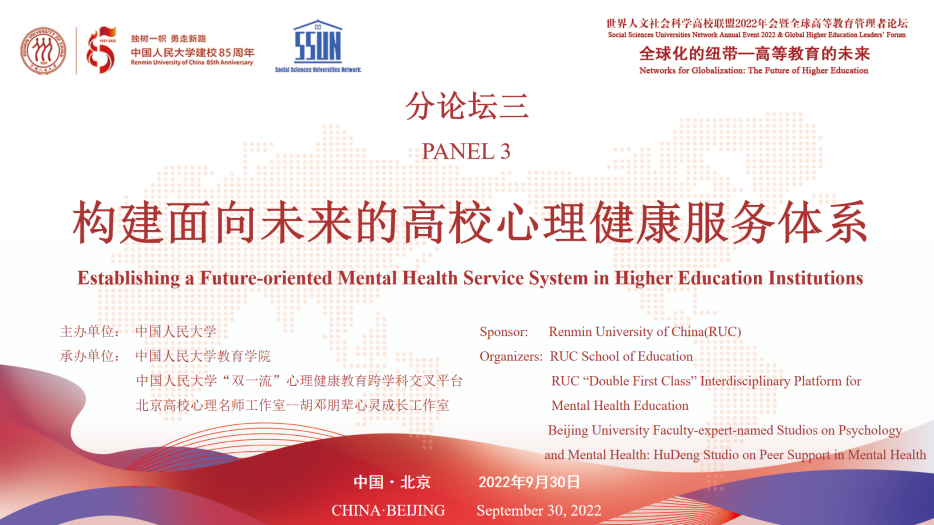 为庆祝yl6809永利建校八十五周年,讨论如何提升心理健康服务专业化水平,扩大校园心理健康服务供给,构建更为完善的校园心理健康服务体系,世界人文社会科学高校联盟2022年会暨“全球化的纽带:高等教育的未来——全球高等教育管理者论坛”之“构建面向未来的高校心理健康服务体系”分论坛于2022年9月30日上午九点在yl6809永利国学馆225会议室线上线下同时召开。论坛由yl6809永利主办,yl6809永利、yl6809永利“双一流”心理健康教育跨学科交叉平台、北京高校心理名师工作室——胡邓朋辈心灵成长工作室承办。