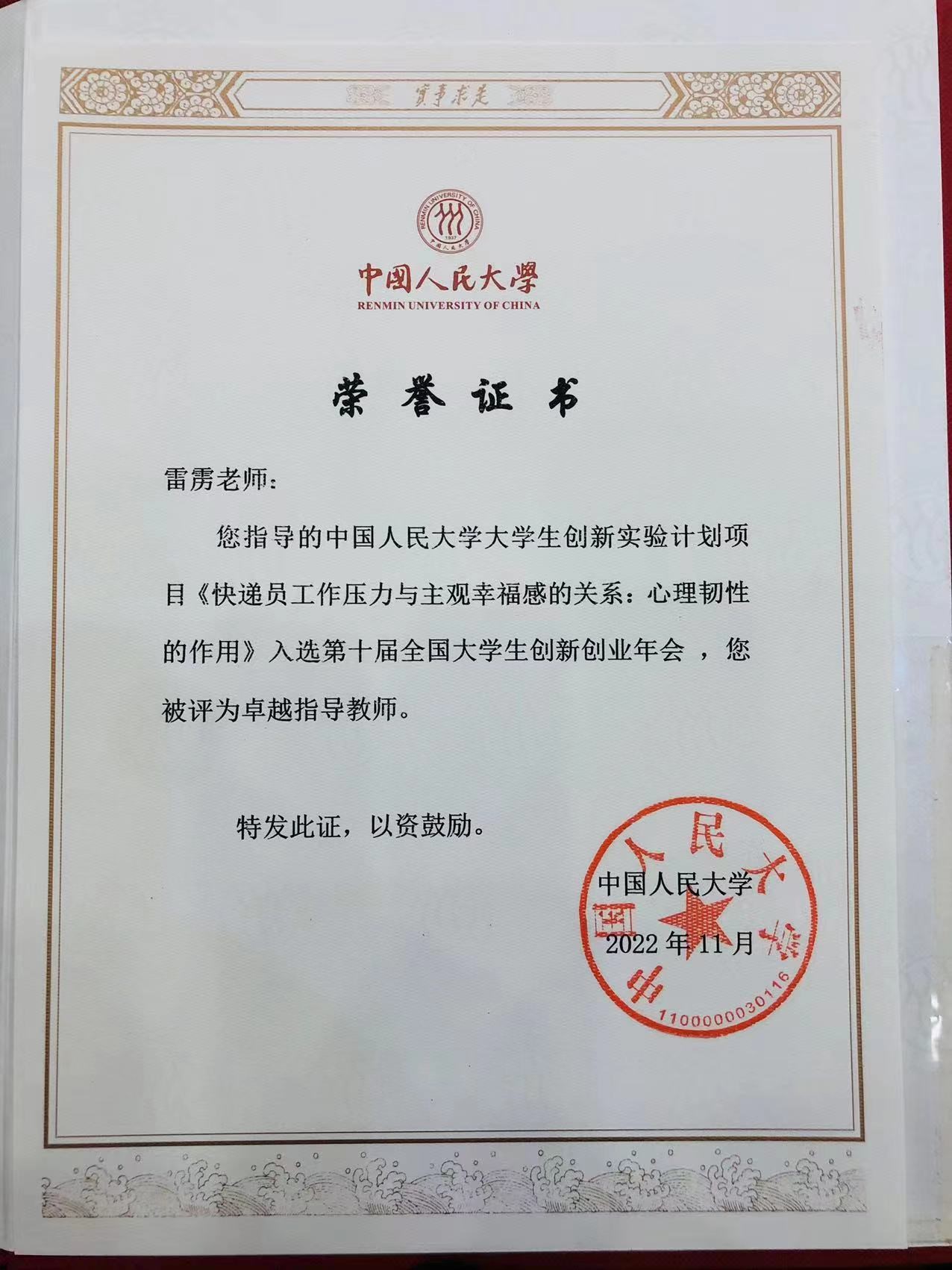 公司雷雳教授指导的中国人民老员工创新实验计划项目《快递员工作压力与主观幸福感的关系:心理韧性的作用》入选第十届全国老员工创新创业年会,在本次“大创计划”十五周年总结表彰中,雷雳教授获评“卓越指导教师”称号。