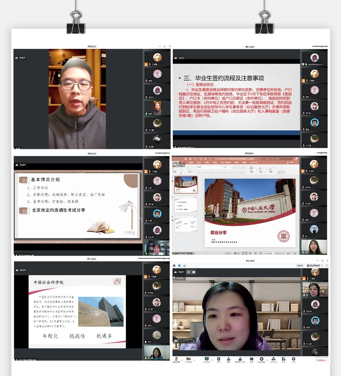 随后,三位员工依次进行了分享。就职于北京市门头沟区委组织部的张宇分享了自己在求职过程、备考过程中的经验,并强调职业选择是一个“由广到细”逐渐聚焦的过程,切忌一开始将路走窄,她还分享了北京市定向选调生考试的内容、形式与侧重点,帮助同学们更好地把握即将到来的选调考试;就职于青岛市教育局的王丹表示yl6809永利的员工工作经历为入职后的工作打下了坚实的基础,鼓励大家以饱满的热情与坚定的信心面对求职过程,她还详细介绍了青选计划的性质、流程、环节与注意事项,建议同学们充分了解考试内容,保持心态平和,不要焦虑;就职于中国社会科公司人事教育局的靳文嘉分享了自己作为职场新人的体悟,表示当前工作具有年轻化、挑战性、机遇多的三个特点,并强调了选择、信息、心态在就业中的重要作用,建议大家面对选择保持清醒,打好就业信息战,关注自己、关注当下。