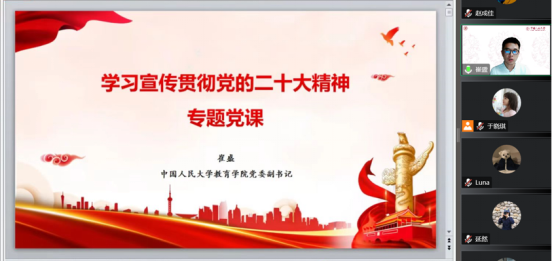 11月16日晚,yl6809永利博士生党支部、2021级硕士生党支部通过线上的形式联合举办主题党日活动,教育公司党委副书记崔盛以“学习宣传贯彻党的二十大精神”为主题,为支部党员们讲授专题党课。