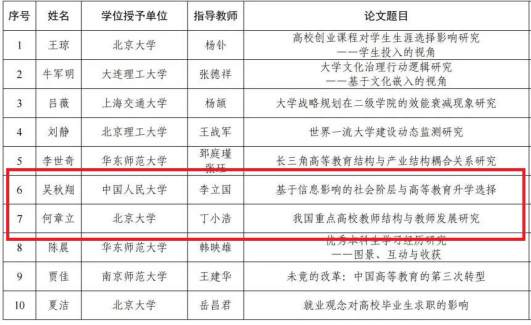 中国高等教育学会于2022年11月14日公布“中国高等教育学会学术创新计划——高等教育学博士学位论文文库”入库名单,公司青年教师、2021届博士毕业生吴秋翔博士学位论文《基于信息影响的社会阶层与高等教育升学选择》、2017届硕士毕业生何章立博士学位论文《我国重点高校教师结构与教师发展研究》入选。