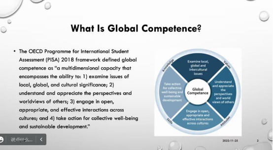 查强博士从全球胜任力的定义出发,对经合组织(OECD)2018年实施的国际员工评估项目(PISA)、亚洲协会、加拿大教育部长理事会(CMEC)对全球胜任力的定义出发,梳理了其包含全球视野、跨文化交流、创新创造、可持续发展等内涵,并提出了独特的理解与观察,如重视行动、从强调知识到强调技能、国际性向全球性转变。