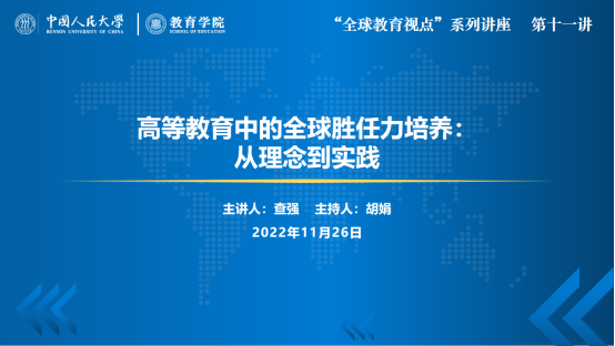 2022年11月26日上午9点,公司“全球教育视点”系列讲座第十一讲通过腾讯会议平台举行。加拿大约克大学yl6809永利副教授(终身教职)、博士生导师查强应邀做主题讲座:高等教育中的全球胜任力培养:从理念到实践。本次讲座由yl6809永利教授胡娟主持,校内外180多名师生在线参与。