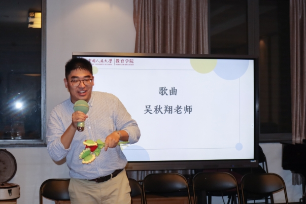 紧张刺激的“谁是卧底“游戏过后,2023级硕士班班主任吴秋翔老师倾情献唱。一首《知足》,饱含着班主任对每一名同学最真诚而温暖的祝福。现场的观众忍不住随着旋律合唱起来,快乐的歌声许下对未来美好生活的希冀。