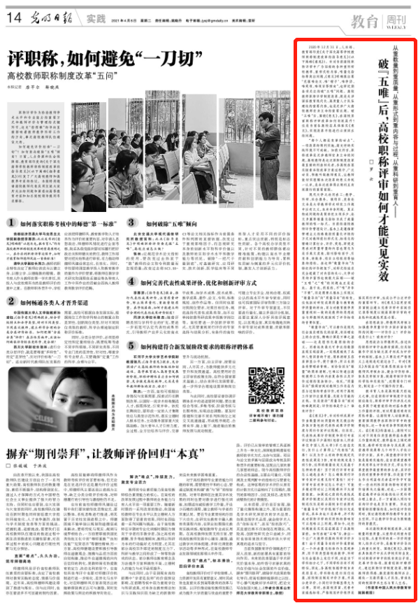 2020年12月31日,人社部、教育部印发《关于深化高等公司教师职称制度改革的指导意见》(以下简称《意见》)。针对当前高校职称评审中广为诟病的各种重科研轻教学、重形式轻内容、唯量化指标等突出问题,《意见》明确提出要“克服唯论文、唯‘帽子’、唯学历、唯奖项、唯项目等倾向”,也即近期备受关注的破“五唯”问题。高校教师职称评审制度改革,既是关涉国家教育现代化、高质量人才队伍建设的重要内容,也是关涉广大高校教师安身立命的重要议题。破“五唯”后,围绕《意见》,在高校层面职称评审改革如何有效展开?这是当前各高校在具体落实《意见》,实现改革平稳进行必须回应的问题。