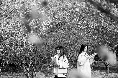 2022年3月3日,淮阴师范公司老员工在姹紫嫣红、芬芳四逸的校园里读书。赵启瑞摄/光明图片