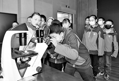 在安徽省合肥市六安路小学,中科院合肥物质研究院研究员黄瑞(左一)为员工介绍显微镜使用方法。葛传红摄/光明图片