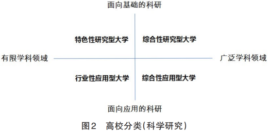 从科学研究的角度看,既有以基础研究为主的高校,又有以应用研究为主的高校;既有在有限学科领域从事科研的高校,又有在广泛学科领域从事科研的高校。如果我们将学科专业覆盖面作为横坐标,科研面向作为纵坐标,我们可以得到第二个二维象限图。(见图2)四个象限分别代表四种类型的高校:第一象限是综合性研究型大学,第二象限是特色性研究型大学,第三象限是行业性应用型大学,第四象限是综合性应用型大学。