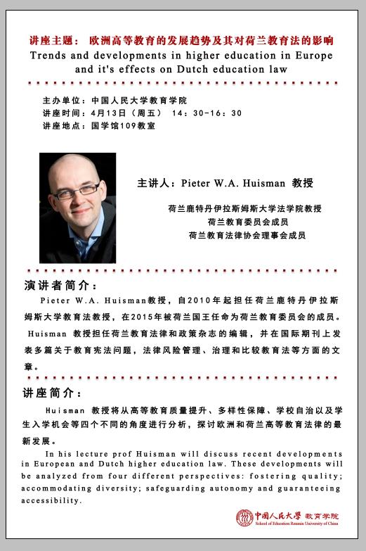 讲座:4月3日Pieter W.A. Huisman——欧洲高等教育的发展趋势及其对荷兰教育法的影响